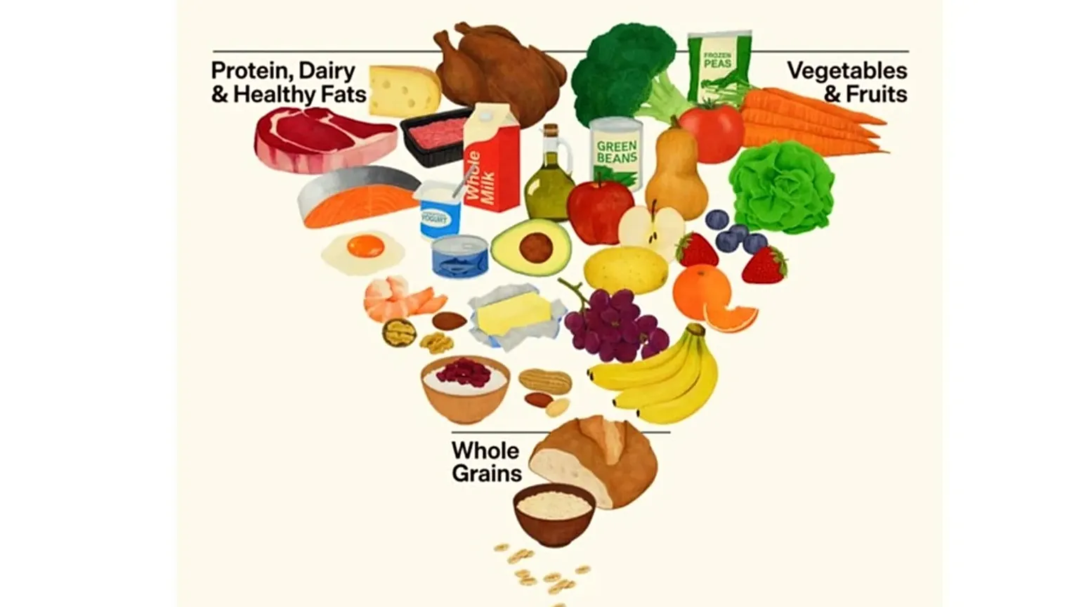 Klasik piramit modelinde tabanda yer alan işlenmiş karbonhidratlar ve tahıllar, yeni rehberde daha kısıtlı bir alana çekilmiştir. “Gerçek Gıda” odaklı yeni modelde proteinler ve taze sebzeler önceliklendirilmiştir.