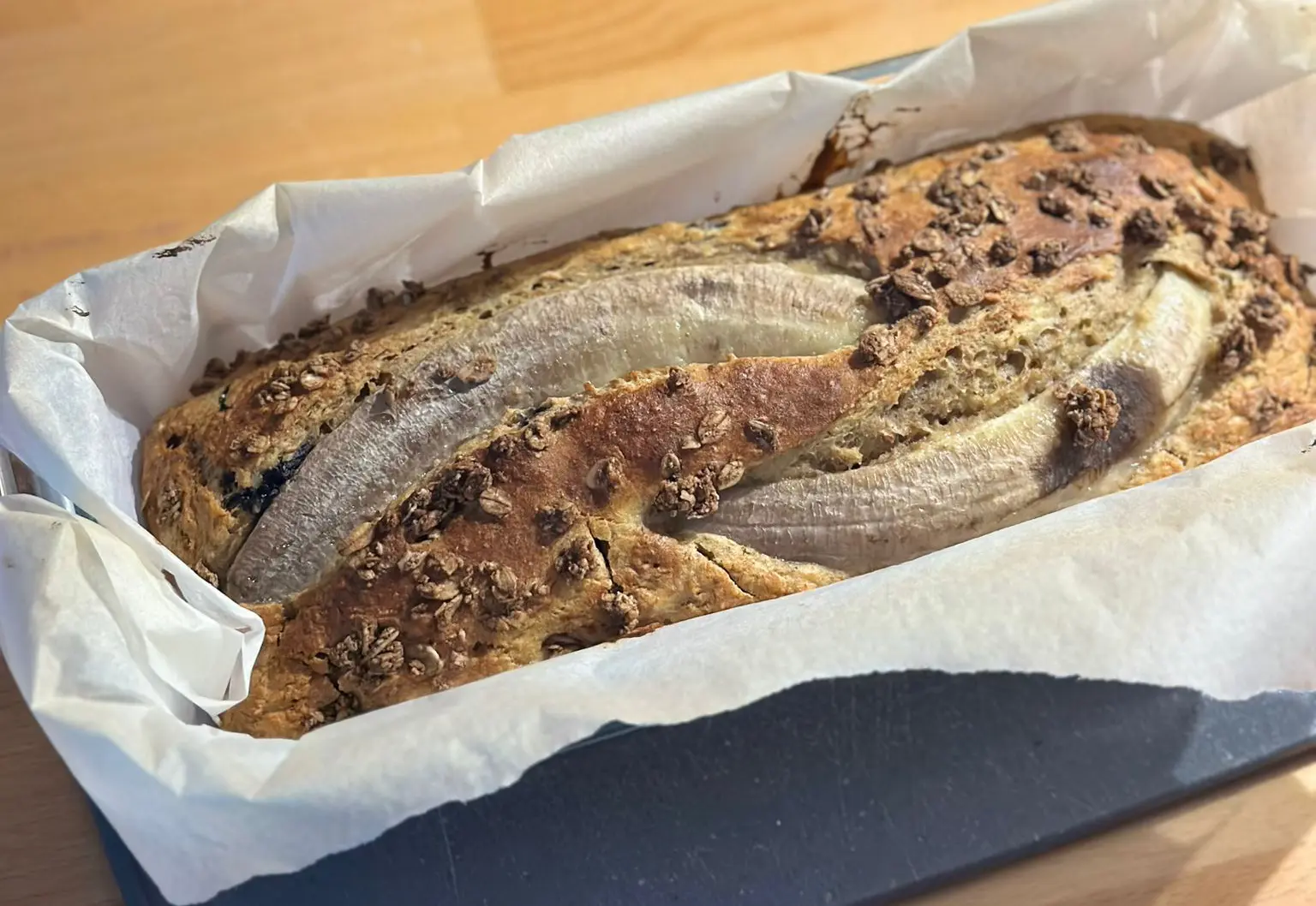 - Kalıba dökün: Karışımı yağlı kağıt serili kek kalıbına alın, üzerini muz dilimleriyle süsleyin.