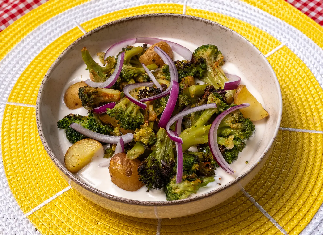 Kış aylarında hem besleyici hem de doyurucu bir salata arıyorsanız, bu yoğurt soslu sıcak kış salatası tam size göre! Fırında pişen brokoli ve patatesin yumuşacık dokusu, tahinli yoğurt sosu ile birleşince harika bir lezzet ortaya çıkıyor. Üstelik pratik, sağlıklı ve tek porsiyonluk!